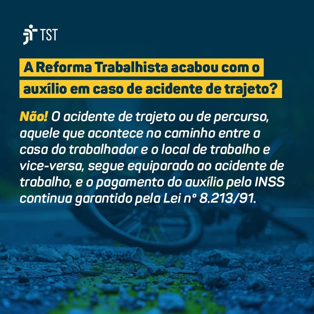 A Reforma Trabalhista de 2017 (Lei nº 13.467/2017) retirou o tempo de deslocamento da jornada de trabalho da CLT. Mas o acidente de percurso continua sendo considerado acidente de trabalho, conforme a Lei nº 8.213/91. Isso garante pagamento de auxílio pelo INSS, se o trabalhador contribuir com a Previdência Social.